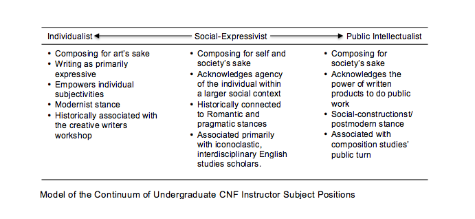 Much like Wendy Bishop in her “Places to Stand,” I find the act of defining the possible places to stand in relation to disciplinary ideologies to have powerful epistemological potential for both teachers and students because those ideologies are linked to the ways that knowledge is shaped within and beyond universities internationally. Therefore, in this chapter I look to scholarly discourse from creative writing studies and composition studies to define, historically contextualize, and complicate the three instructor subject positions that I have placed on a continuum in order to better explain the dominant ideologies that appear in CNF teacher talk: CNF discussed as art for art’s sake (individualist) is at one extreme, CNF discussed as a type of writing that maintains personal agency while serving larger public purposes (critical expressivist) in the middle, and CNF discussed as useful only for its impact on audiences within and beyond the academy (public-intellectualist) at the other extreme (see chart below).